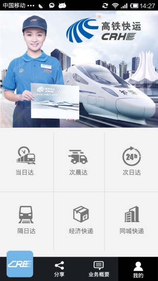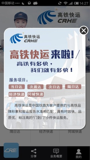 1.新增高铁快运:具有时效快、品质优、标注高的“门到门”小件快运服务客户可使用当日达、次晨达、次日达、隔日达、经济快递、同城快递下单寄件