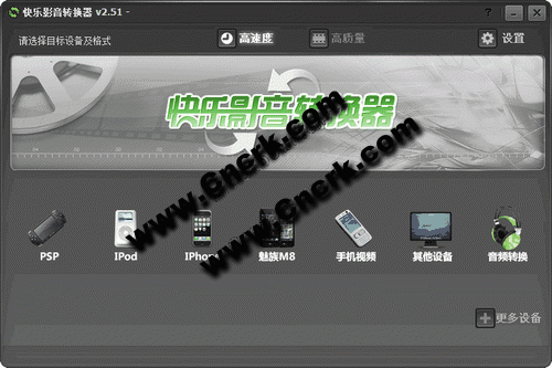 快乐影音转换器能将常见的电脑视频格式,转换成MP4、AVI、PMP、3GP、AMV、MOV等设备所需要的格式。