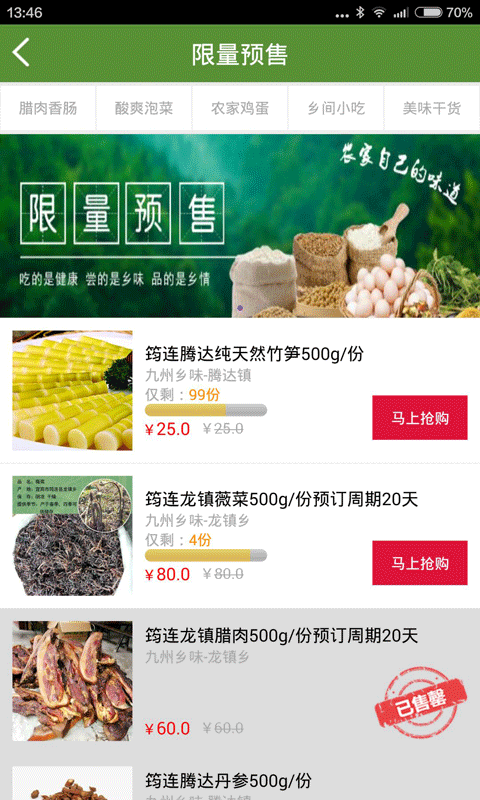 【限量预售】精心挑选应季农产品,提供生产前预订销售。【尊享定制】根据口味、包装等要求提供私人定制服务。