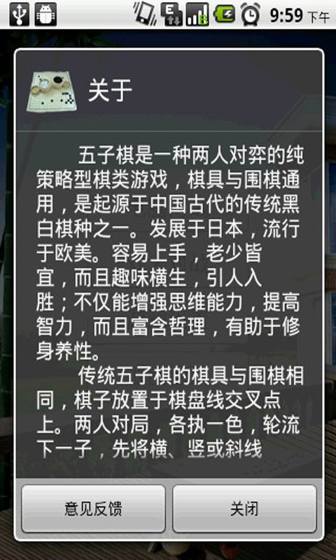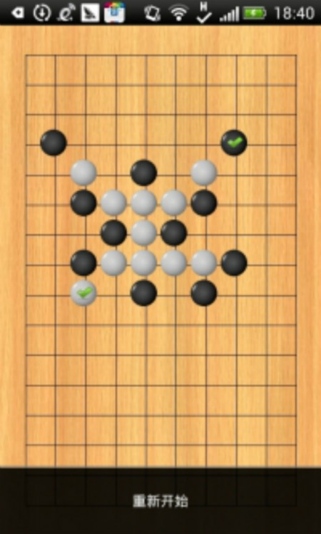一种两人对弈的纯策略型棋类游戏,棋具与围棋通用,是起源于中国古代的传统黑白棋种之一。发展于日本,流行于欧美。容易上手,老少皆宜,而且趣味横生,引人入胜;不仅能增强思维能力,提高智力,而且富含哲理,有助于修身养性。 传统五子棋的棋具与围棋相同,棋子放置于棋盘线交叉点上。两人对局,各执一色,轮流下一子,先将横、竖或斜线的5个或5个以上同色棋子连成不间断的一排者为胜。