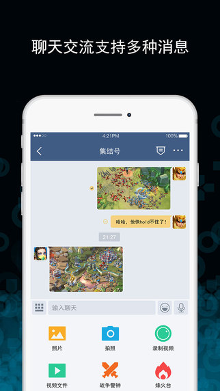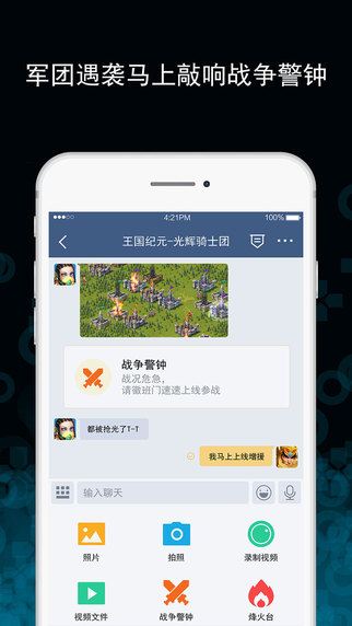 战争状态,怕被敌人偷袭?来WeGamers,在线的成员一旦发现敌情,打开App,发起战争警钟,马上上线进行防御。