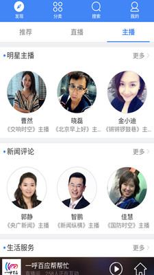 【专业的内容推荐】小编每日精选电台精彩栏目!特色主播!随时都有新内容,每天都有大发现。火热的电台节目,人气的电台主播,小编帮您一网打尽!【真实的互动直播】中央台节目主播与您实时互动!弹幕、社区、打赏、互动游戏!您再也不用自娱自乐,您的声音、您的看法、您想表达的一切,都可以直接让节目主播看到哦!广播新升级不光能听,还能玩!