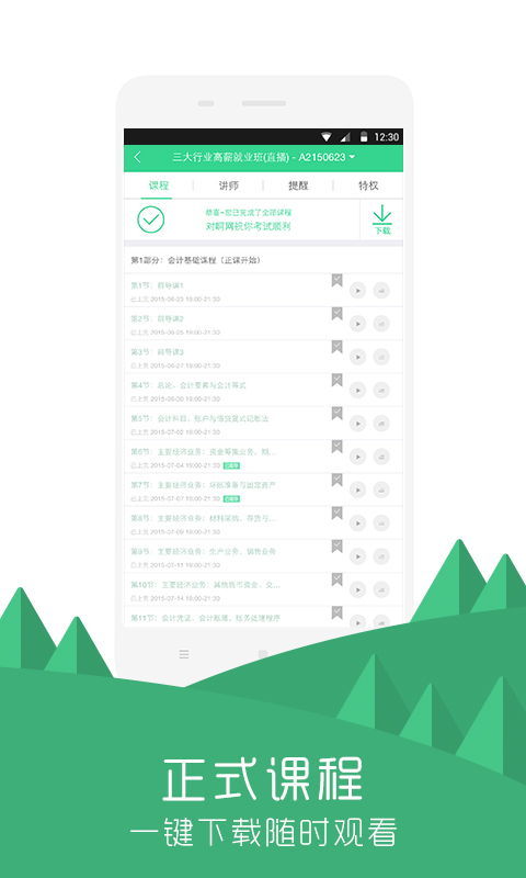 1、正课班级:实时互动,教师在线指导;2、题库:百名教师精准解析,必备考点全面覆盖;