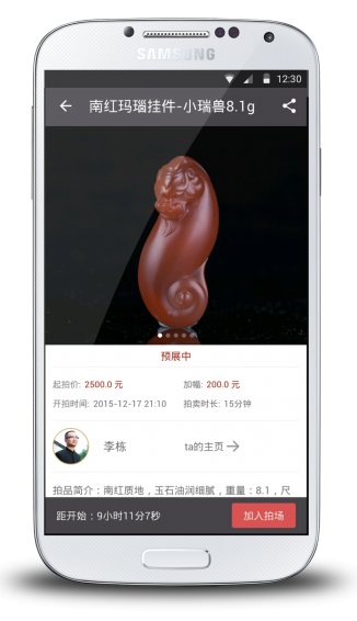 艺拍圈是一款为广大古玩、文玩、手工艺术品等玩家和手工艺人打造的集聊天、交友、拍卖、淘宝、捡漏为一体的交易、交流平台。艺拍圈的亮点是每日实时竞拍,玩家们随时随地都能在游戏式的操作中享受淘宝、拍卖的乐趣,结交到志趣相投的好友,捡到意想不到的漏。