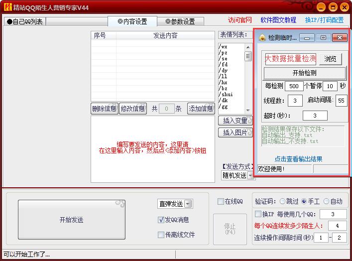 由精站网络营销团队开发的一款专门针对QQ陌生人进行临时会话的软件,自动批量对支持临时会话的QQ不加好友群发陌生人消息, 最大限度模拟真实操作,充分利用无需加QQ好友而能直接发送消息这一QQ营销模式。