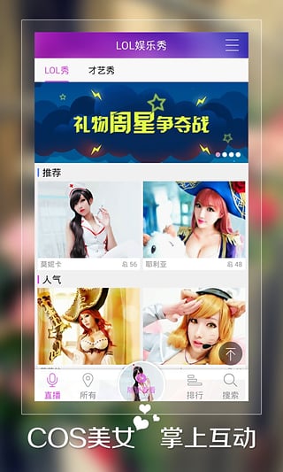 LOL娱乐秀app是一款角色扮演真人直播客户端应用,LOL娱乐秀为游戏玩家带来激情,刺激,有趣,挑战的娱乐平台,让您与众多美女主播在线互动,聊天交友,并且让喜欢英雄联萌者可以及时交流经验,快来下载体验吧!【功能介绍】