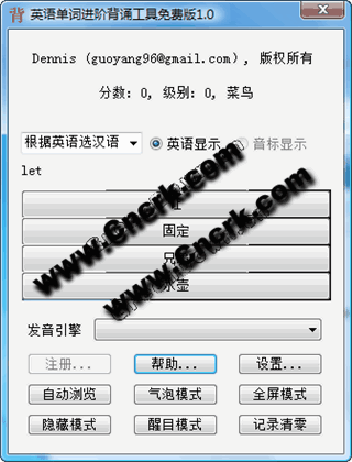 英语单词进阶背诵工具是一个用来背英语单词的工具软件,它采用了日语单词进阶背诵工具的引擎。它是一个绿色软件,解压后可以直接运行执行文件。该工具简洁实用。它采用类似GRE机考的模式,出题让用户选择正确答案。开始出现的单词为难度低的单词,答对后用户的分数逐渐增长, 单词的难度也增加。对于初学者,软件总是出容易的题; 而对于水平高的人,单词难度逐渐增加。因此能适合各种英语水平的用户。而且, 一个单词本身的难度是动态调整的, 单词答对了, 该单词本身的难度就降低, 单词答错了, 该单词本身的难度就上升。因此它是一个能自动适应用户水平的工具软件。
