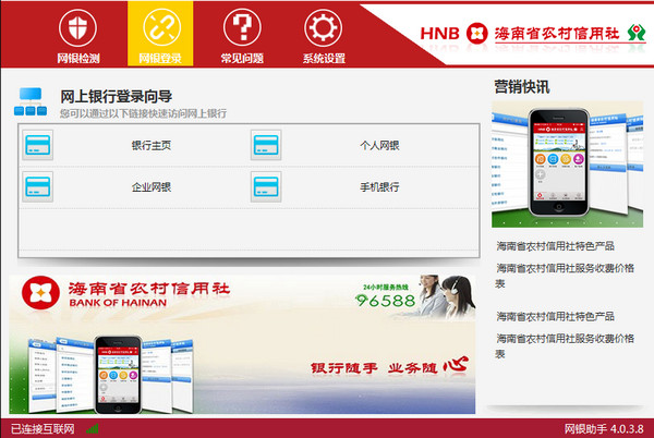 海南农信网银助手下载 4.0.3.8 官方版 海南农信网银助手是一款专为海南农村信用社的用户们推出的网银安全工具。下载并安装该助手后,即可保障您网上交易环境的安全性,让您更加放心的交易。