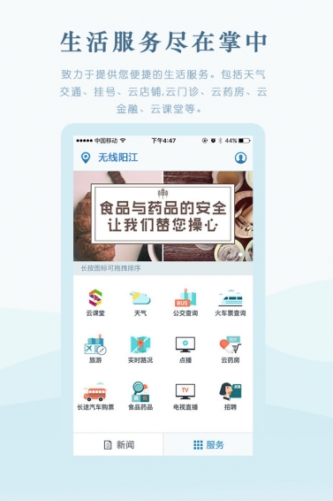 无线阳江是一款手机新闻资讯阅读软件,无线阳江为你实时播报广东省内热点焦点新闻,同时涵盖了天气、交通、挂号、云店铺、云门诊、云药房、云金融、云课堂等多种生活服务,为你提供方便专业的全方位生活信息服务。无线阳江是阳江广播电视台与广东广播电视台旗下企业———广东南方新媒体发展有限公司联合打造的综合性客户端,功能涵盖新闻资讯、政务信息、民生服务、城市生活和电子商务等各个方面,将为阳江本地及省内外用户提供贴心周到的服务。无线阳江,无限可能!