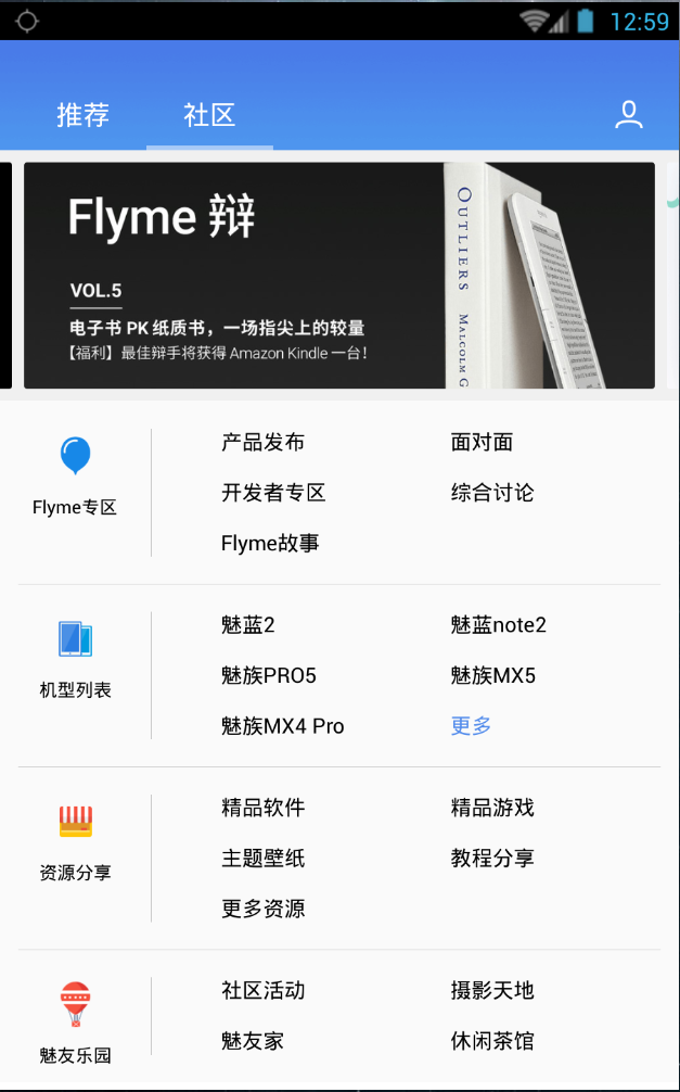 以分区形式展示社区包含的所有版块,包括:Flyme专区、机型列表、资源分享、魅友乐园。机型区默认显示5个热门机型,其余可以点击「展开」查看。