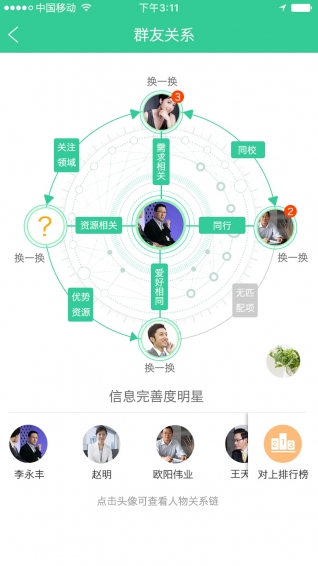 用户在【】应用中填写自己的资料后,【】应用会基于BPCI(商业合作潜力指数)商业算法的基础,为用户匹配出最有合作潜力的群友,在经过智能筛选后的商业伙伴,用户在商业社交时更高效、更有价值。