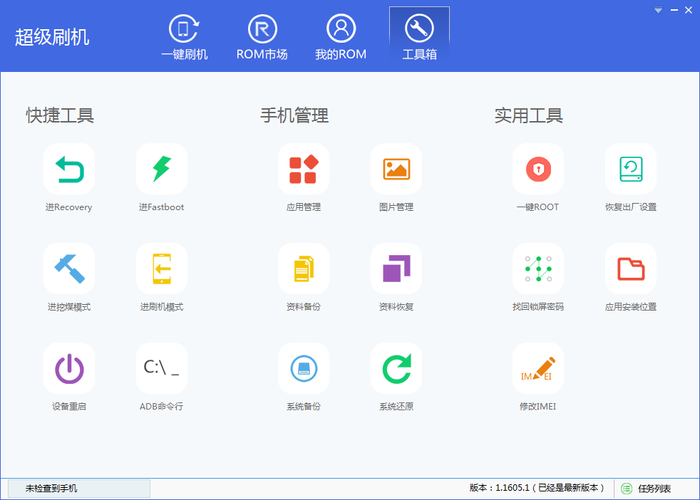 超级刷机是一款在线刷机工具。该工具不仅小巧绿色,还可支持99%以上的安卓机型,可以快速帮助安卓手机机主进行刷机,免去了去论坛上下载工具的烦恼。