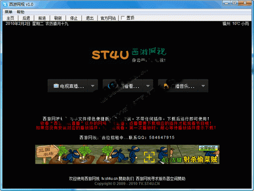 西游网视(ST4U)是一款集P2P直播点播于一身的绿色免费聚合网视播放平台软件!聚合了目前国内外最流行的PPstream、pplive、QQlive、UUsee、沸点网视、TVants、Sopcast、TVUplayer、CCTVBox、Sohu、SINA高清直播等网络电视直播,聚合了PPS,pplive,沸点,UUsee,Qvod快播,讯雷看看、皮皮等多种影视点播平台软件!西游网视是一款先进的网络电视聚合软件,同时继承了P2P网络电视越看越流畅,人越多越快的优点!支持对海量电影,电视剧,动漫,综艺节目等影视内容的在线直播点播观看。只要下载西游网视软件,你可以免费看到大陆、香港、台湾、国外等2300套高清直播节目,和全球35000部最火爆首映电影,及数万套热播电视剧高清点播!并且,这一切都是100%免费的!