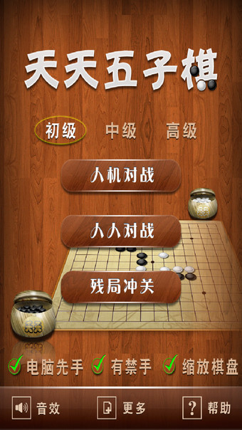 天天五子棋根据五子棋的规则开发的一款五子棋休闲游戏。目前设定的了人人对战、人机对战和残局冲关3种模式。人人对战和人机对战模式可自由选择棋色和是否直接禁手,残局模式默认带禁手且黑棋先。电脑棋力水平不容小觑。内置VCF残局冲关从易到难72题,不仅适合初学者学习冲杀,也可以提高高手在残局阶段的绝杀能力。