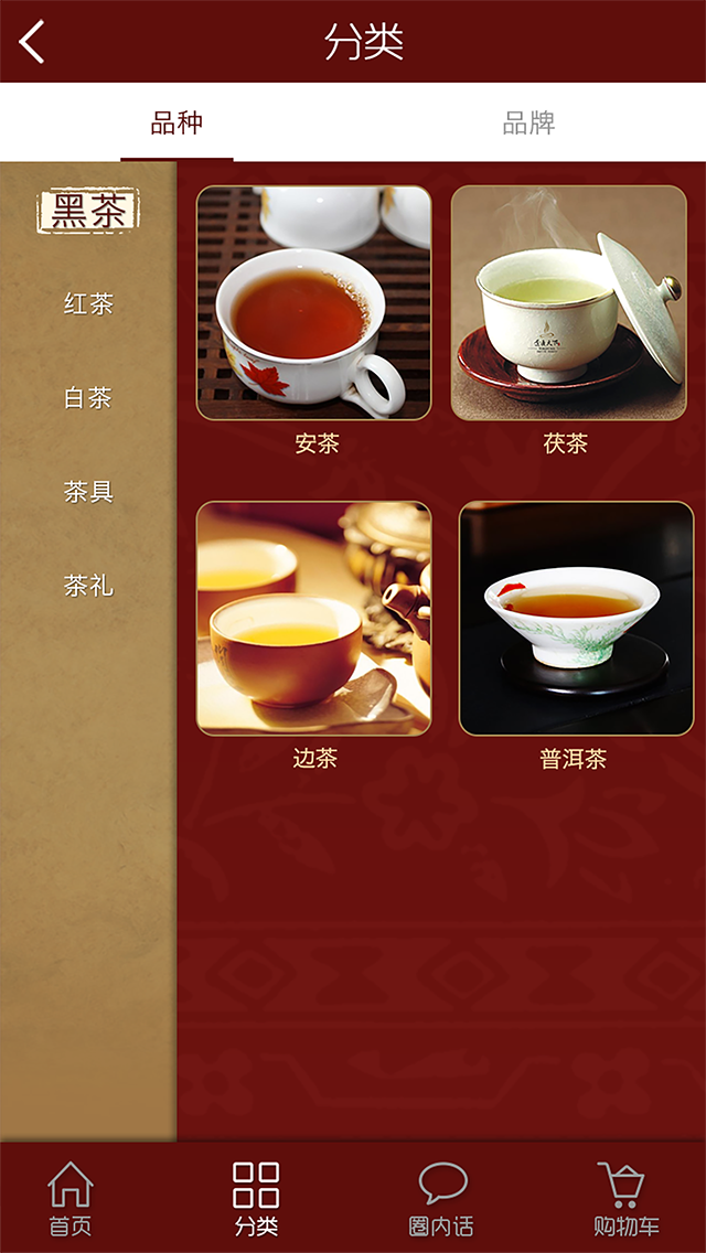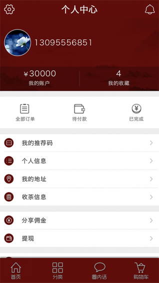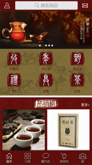 进入“陈茶会”首页后,可以看到收藏茶、年份茶、野生茶、茶礼、茶具、收茶等六大品类和分类、圈内话、购物车、家(个人中心)等四大板块。其中,在茶品分类中有黑茶、白茶、普洱茶、茶具、茶礼等板块,用户只需点击板块标签,即可了解产品详情。此外,合作销售人员可以进入“个人中心”版块,直接了解、查询个人的直销佣金、奖励机制等,也可以在茶圈内发表个人评语,与同道茶人互动交流等。