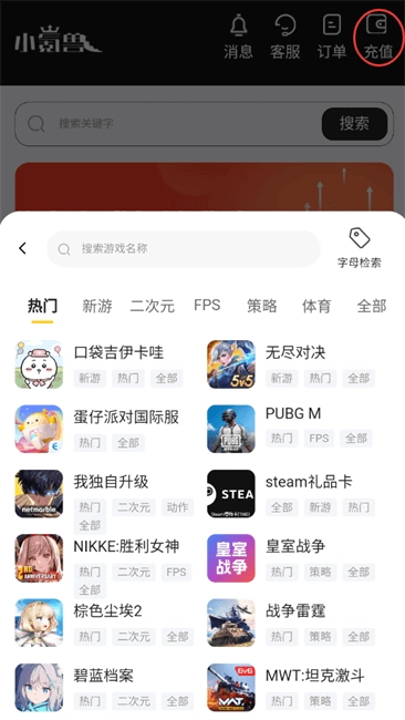 2、于首页上方最右侧寻找到“充值”按钮。(既能够直接点击充值,也能够先选好游戏,之后再点击充值。)