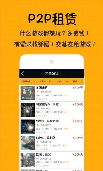 3.点对点租赁,帮助玩家与附近机友建立交易,相互租赁一周目闲置游戏,节省更多游戏开销。平台根据距离,响应时间,诚信度等多维数据为玩家推荐交易对象,出租租赁更便利!