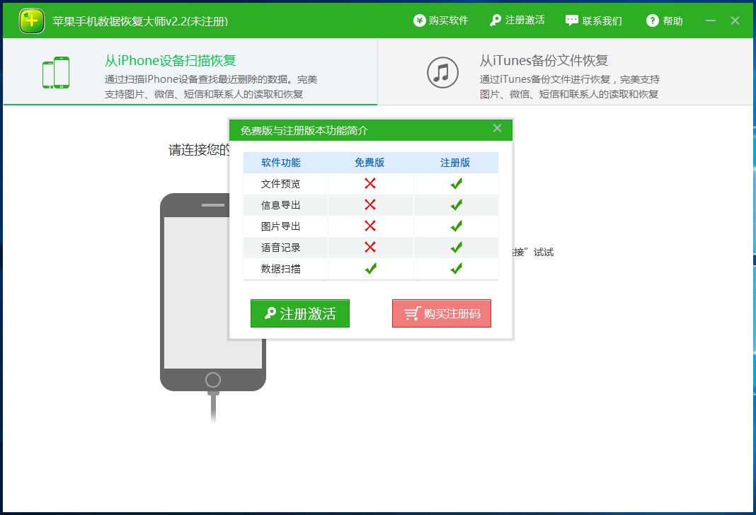 互盾苹果手机数据恢复大师是一款功能强大的苹果数据恢复软件,通过互盾苹果手机数据恢复大师你可以恢复苹果手机里删除的通讯录、微信聊天记录,误删的手机照片以及重要的短信内容都可以进行一件恢复。同时软件支持所有IOS设备因误删或格式化导致丢失的各种文件。是苹果手机数据恢复软件中效果最好,恢复成功率最好的一款数据恢复软件。