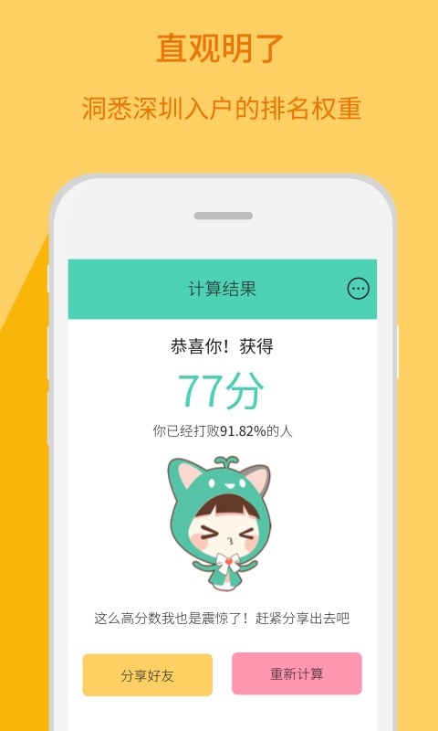 【直观明了】计算结果直观明确,让您洞悉自己在深圳外来人口中的比例位置和排名权重,对于入户达标的距离有个全面的考量。