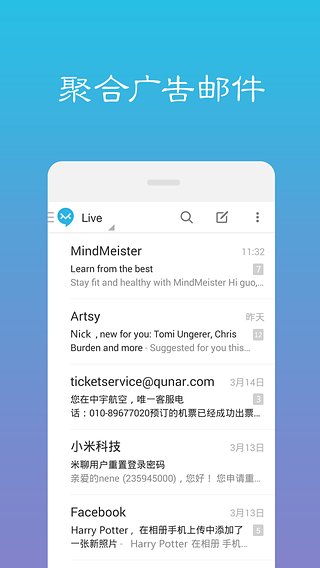 * 秒加帐户。12秒能做什么?添加6个邮箱,标记1000封邮件12次。* 快省的新邮件推送,让你总是第一个知晓;