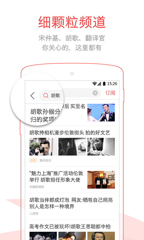 1.细颗粒频道依托中搜强大的第三代搜索引擎技术抓取新闻资讯,一网打尽你的阅读需求。几十万的资讯频道,你想看的都在必看。这里有欢乐颂,吴亦凡,极限挑战等热点资讯;这里也有军事圈、思享汇、逼格自习室。只需轻轻订阅一次,全方位满足任何用户的阅读需求。