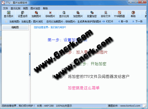 TTU图片加密软件是专门针对Bmp、Jpg等图片进行加密的、非联网验证的加密软件,它集成了文件加密、访问口令、视图缩放限制、防拷屏等功能,能够有效的保护图片作者的权益。软件采用先进的加密技术,复杂的加密算法,同时又优化了图片显示速度和显示模式,是优秀的图片加密与发布软件。