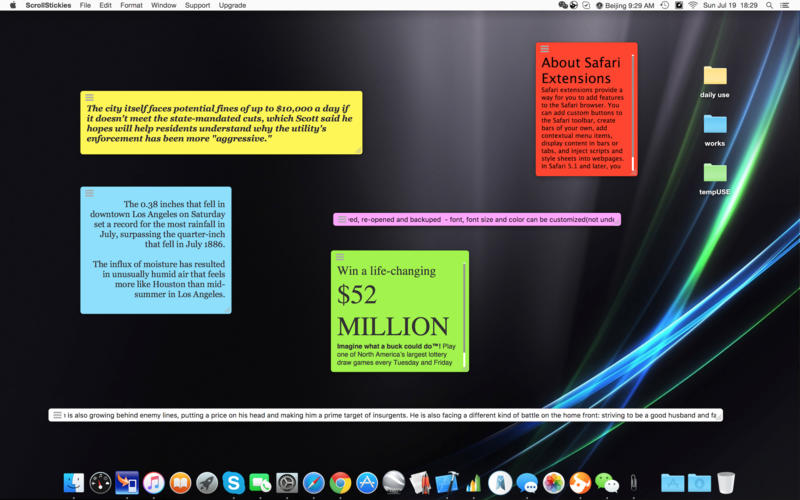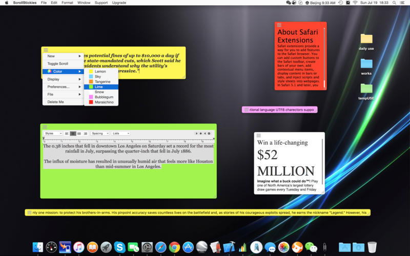 ScrollStickies Mac版是一款 Mac OS X 上的便签应用,ScrollStickies与以往的便签不一样的地方是,当遇到长内容的时候,它会可以让你进行滚动操作,即不用改变便签框的大小也可以浏览全部便签内容。【软件特点】
