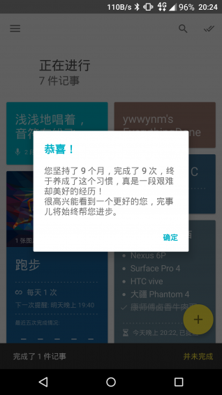 记住事情,完成事情,这对你来说算一个挑战吗?完事儿能够为你提醒日程活动、帮你养成习惯、督促你完成目标,你也可以在完事儿里记下身边的故事与风景,留下美好的回忆。遵循MaterialDesign的界面设计让你领略Android应用的美,在精致的细节中享受流畅的操作,一切尽在完事儿中。