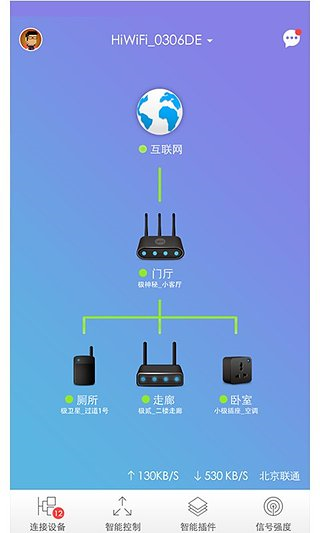 智能控制——极路由App提供智能控制集合管理,将用户常用的功能集中展现。信号强度设置,轻松管理信号强度,无需重启极卫星、无线设备无需断线。无线信号定时开关,到点断网休息戒掉网瘾。一键测速,了解家中带宽速度网络故障轻松判断。信号也会堵车,Wi-Fi信道管理,帮您避开拥堵道路,让网络更流畅。