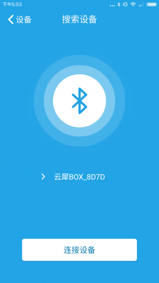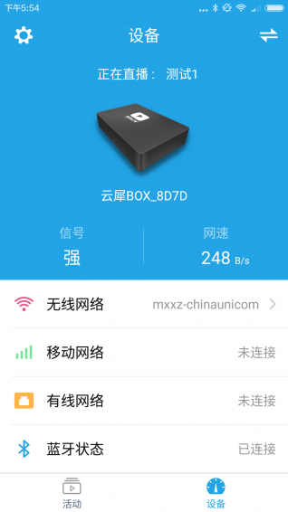 设备详情页面主要是展示云犀BOX的状态,显示的内容有:连接的云犀BOX名称、云犀BOX正在直播的活动名称、云犀BOX的网络链接状态。