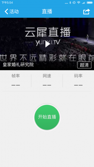 直播详情页面主要用于控制需要直播的活动,可以开始直播、结束直播、调整清晰度,实时观察当前直播活动的码率、帧率、网速。