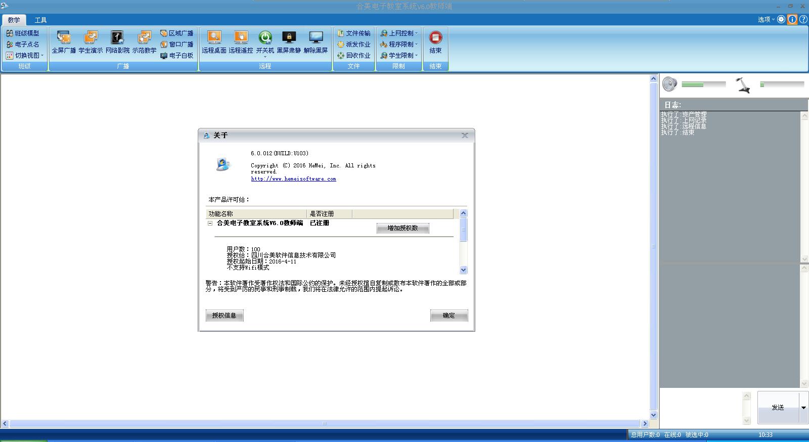 支持*.MPG,*.AVI,*.RMVB/RM,*.FLV等常用视频格式;实现教师演示;学生示范;黑屏肃静;语音教学;网络影院;屏幕监视;遥控辅导;网络考试;试卷分享;屏幕录制;屏幕回放;提交作业;电子教鞭;远程管理等功能;与其它教学应用软件具有良好的兼容性;运行流畅;适应不同屏幕分辨率;提供软件最新版本(含介质) 可以测试100台电脑,试用30天。账号、密码为空。