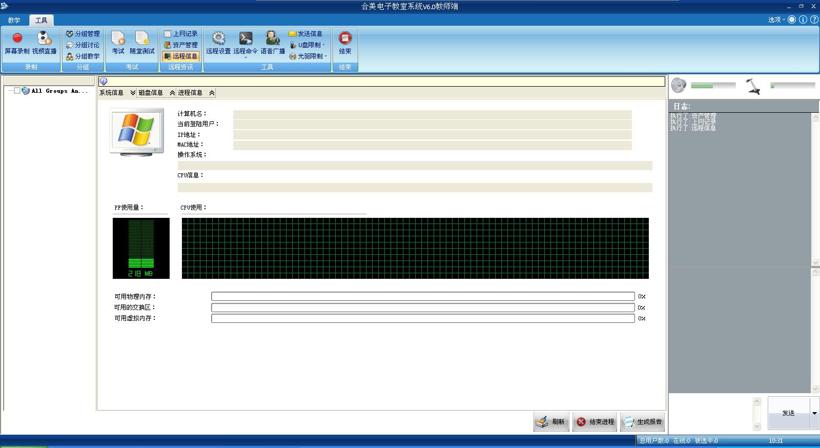 ? 远程信息: 帮助老师了解和分析学生机的最新操作系统信息(当前所使用的操作系统、CPU和内存的实时使用信息)、磁盘信息(硬盘的分区及数据空间占用)、进程信息(当前电脑所开启的应用程序的信息等),以便于查找学生机出现各种异常问题时提供解决办法。