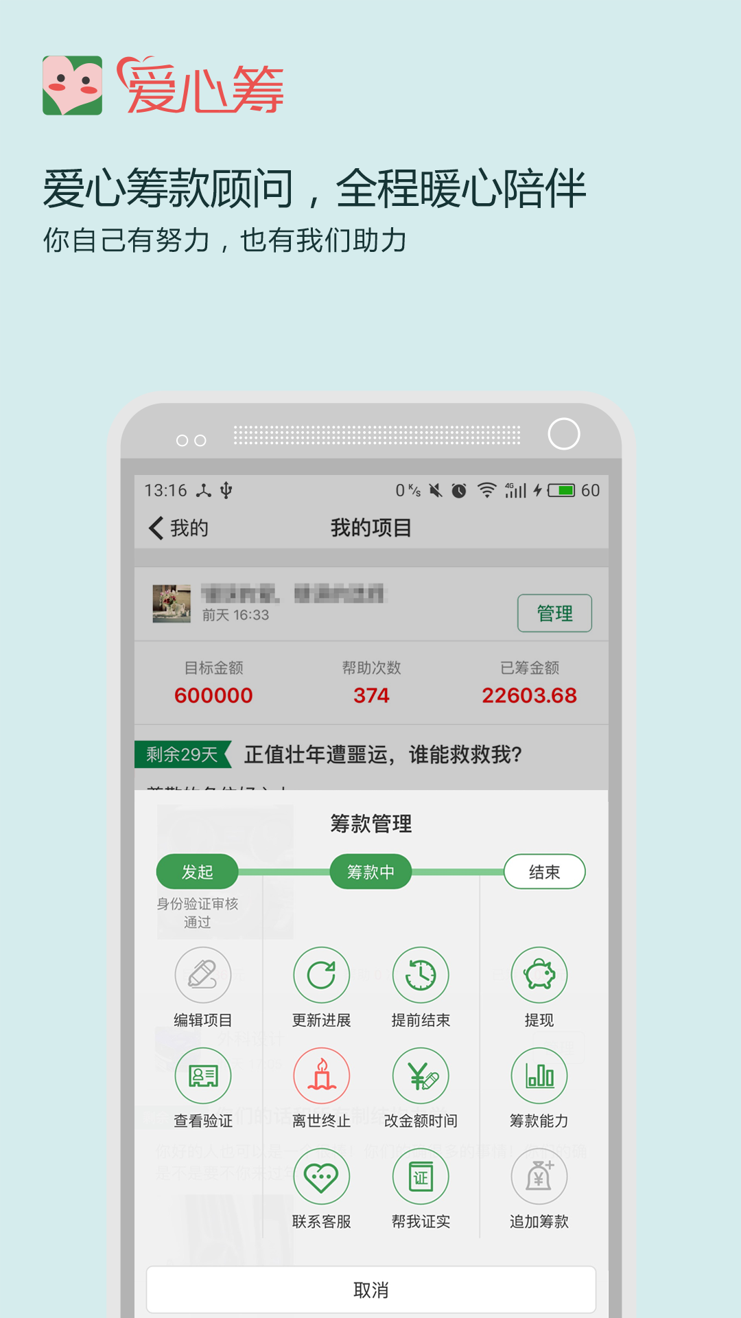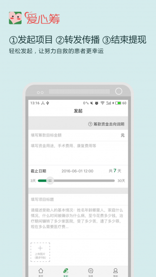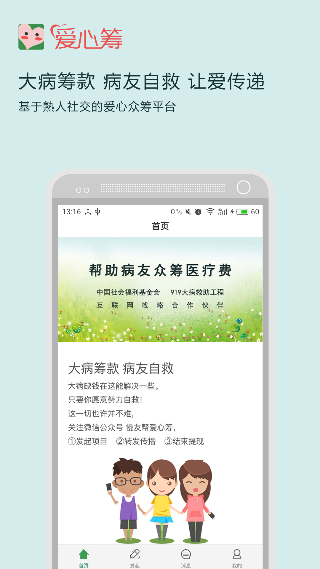 1、专业医疗筹款,基于熟人社交的爱心众筹平台;2、轻松发起,让努力自救的患者更幸运,只需三步:①发起项目 ②转发传播 ③结束提现;
