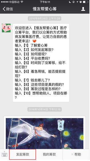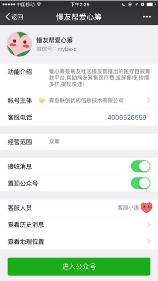如何发起筹款项目?首先进入慢友帮爱心筹官方公众号