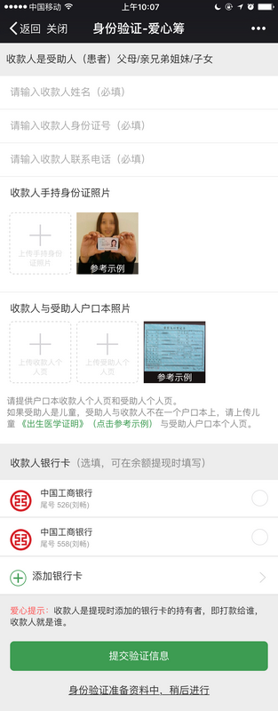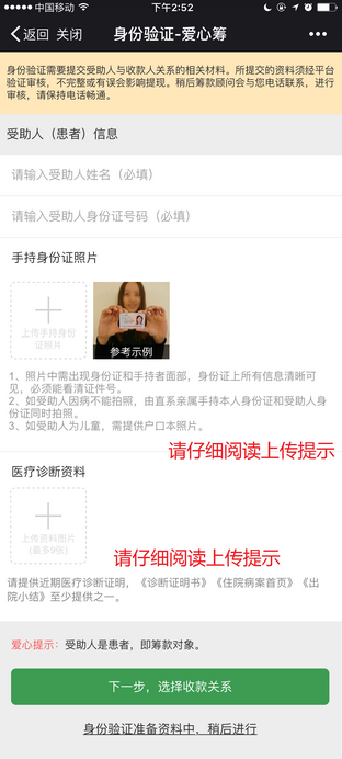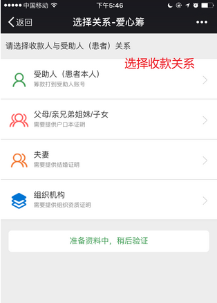 选择收款人与患者的关系(如正在准备资料请点击“资料准备中,稍后验证”,待准备齐全后通过项目页-管理-身份验证进行补充)