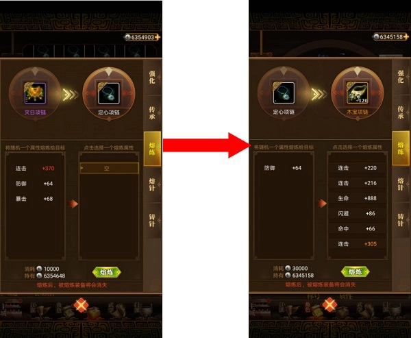 大家在装备方面务必留意一个容易踩的坑。强化后的装备等级,是能够传承给新装备的,千万别把强化后的装备直接当成经验,否则就只相当于一件装备的经验值。此外,装备下方的附加属性可以通过熔炼来更替,这里给大家分享一个小窍门。假设自己现有的装备是A,拥有极品属性的装备是B,此时不要直接用B和A进行熔炼,而是要先找一件白色装备C。要是C运气够好,随机刷出了B的极品属性,接着再把C熔炼给A,如此一来,A就肯定能获得极品属性。 在前中期,四阶玄铁装备堪称最佳选择。集齐2件、4件、7件玄铁装备,还能分别激活三个被动称号,从而增加角色属性。中小R玩家甚至可以一直使用玄铁装备。而玄铁主要依靠经书来兑换,所以经书极其重要。大家前期千万不要随意花费经书,不然等到能兑换玄铁时,后悔就来不及了。