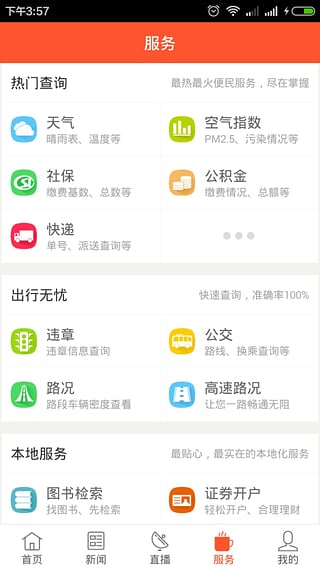 东莞阳光台客户端是东莞广电传媒集团官方新闻客户端、全媒体移动门户和旗舰,致力于创新资讯传播与互动形式、提升本地民生服务能力。东莞阳光台客户端目前囊括了:广播电视直播点播、互动图文直播、新闻资讯、问政、爆料、天气、空气指数、购买电影票、路况、违章查询、查公交、医院挂号、快递查询、社保、公积金查询、图书检索、证券开户、代驾叫车19个功能模块。
