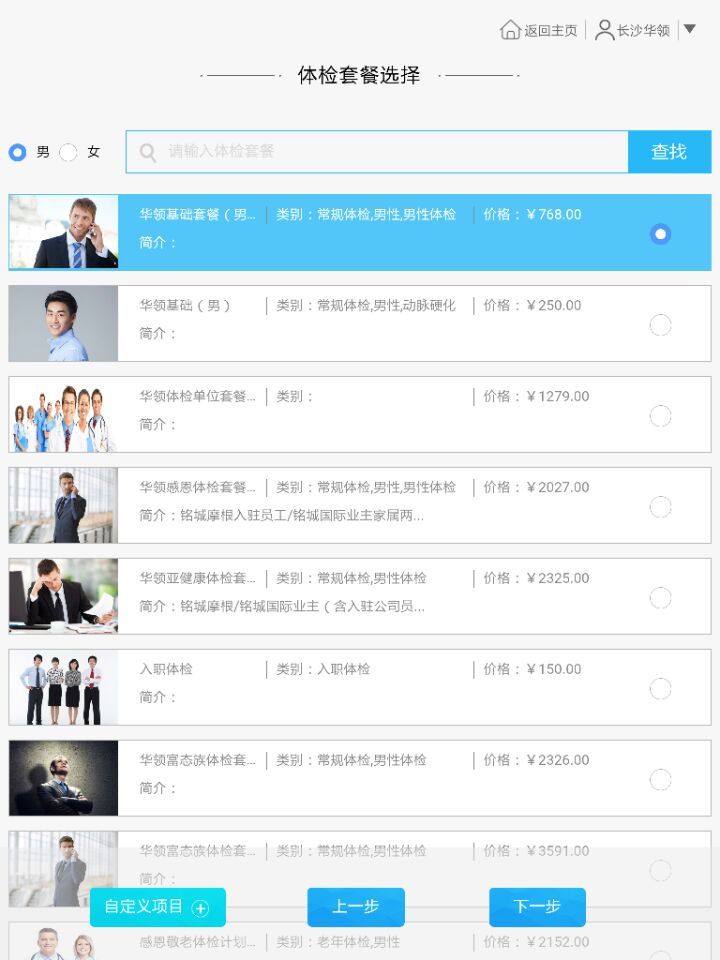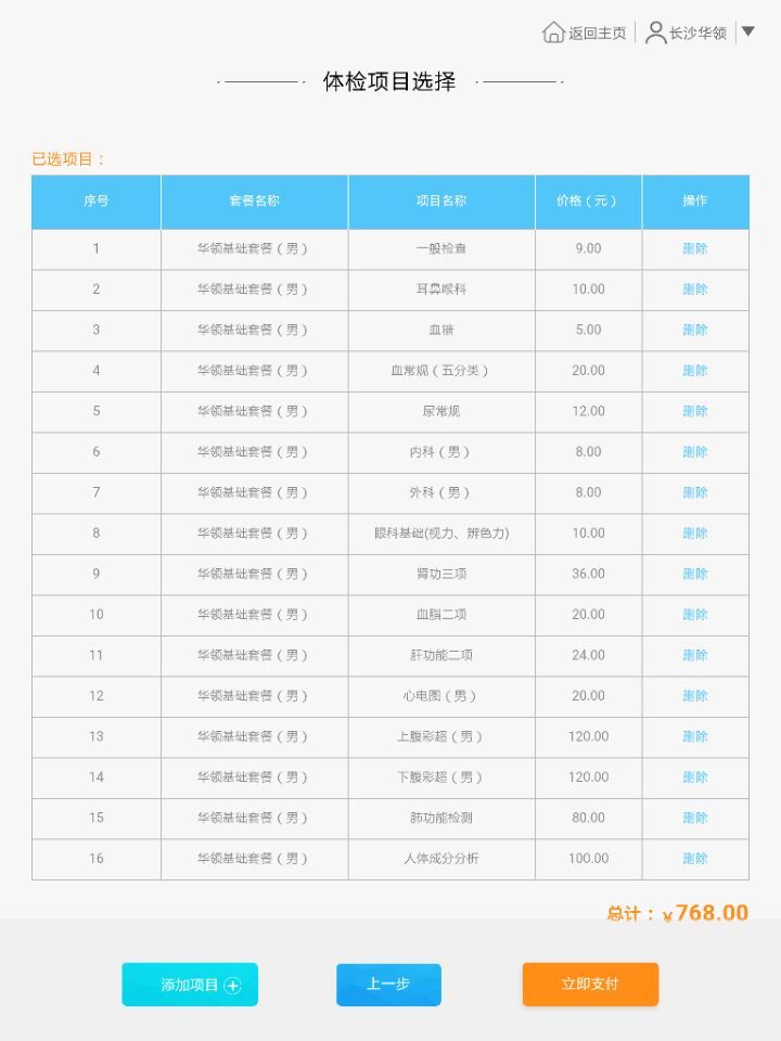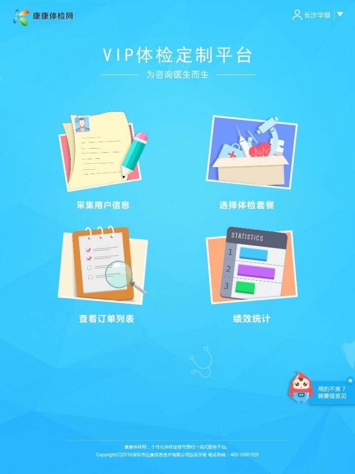 VIP体检定制平台app基于平板设备具备用户采集信息、个性化定制体检项目、在线缴费、订单统计、绩效查询等核心功能。能够在平板上一次性完成用户信息登记、体检项目个性化定制、在线缴费等工作,解决了体检者分别排队登记和缴费浪费时间的问题,简化了体检流程,提高了用户体验,提升了体检机构服务水平。