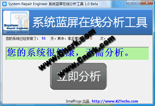 System Repair Engineer 系统蓝屏在线分析工具是 System Repair Engineer 作者 Smallfrogs 新近开发的一个系统诊断工具,专门用户分析 Windows 蓝屏的原因,现在这个工具开始测试了,欢迎试用。 bsdanaly.rar