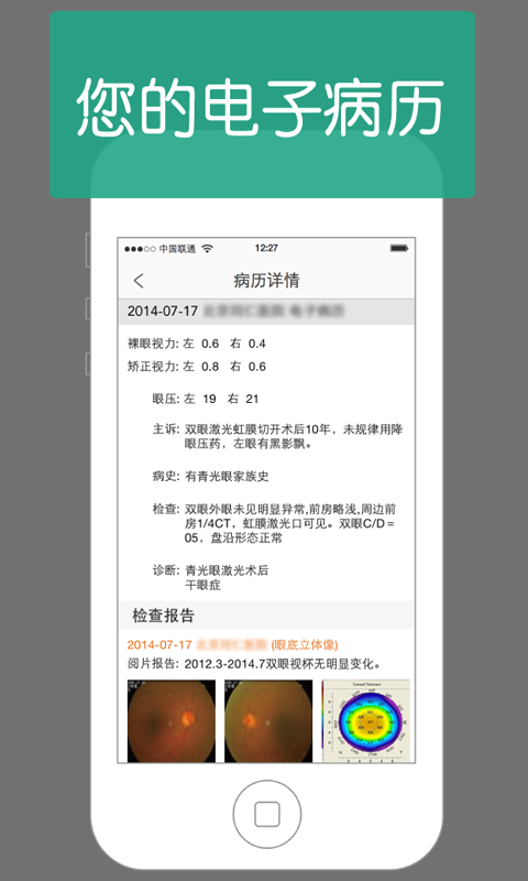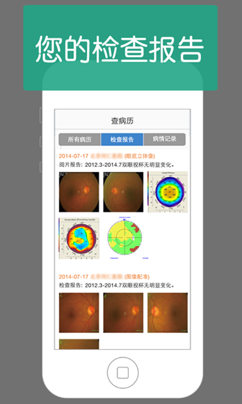 -支持查看眼底照相、OCT、眼前睫、视野计、眼AB超等眼科检查项目报告;