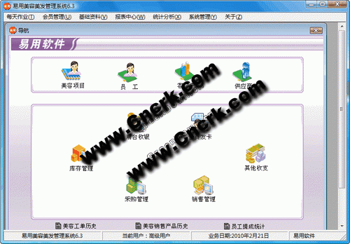 易用美容美发管理系统 V6.3 简体中文绿色免费版 易用美容美发管理软件秉承 易用软件一贯容易又实用的理念;从使用者角度出发,突出实用性,操作方便、简单,界面简洁,不需要专门培训都能使用、操作。安装简单,不需要专门技术人员维护。是一套专门为美容美发行业设计的集业务管理、会员管理、员工提成、工资管理、报表管理、物料进销存管理等功能为一体的会员制综合管理系统。功能包括前台收费、会员管理、冲值卡/消费卡管理、后台查看前台营业、基本资料管理、进货管理、销货管理、库存管理、服务项目、产品销售、员工管理、员工提成、费用管理、营业统计、营业查询等管理。