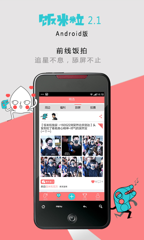 专属饭拍:海量一手内容,直击明星机场,明星见面会、影视歌作品发布会、演唱会、颁奖典礼、综艺节目录制等活动现场,精彩采访报道。追星不息,舔屏不止!饭制周边:爱豆Q版玩偶、日程本、人形立牌、写真DVD、钥匙圈、手机支架等等,上百位饭圈大神授权的原创爱豆周边任君挑选,让粉丝的爱熊熊燃烧!