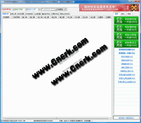天彩时时彩全能助手,是一个支持重庆时时彩、江西时时彩、黑龙江时时彩的时时彩数据分析统计工具,并且集成了常用的功能,从此你玩时时彩,不再需要打开一个个网页和一个个工具了!