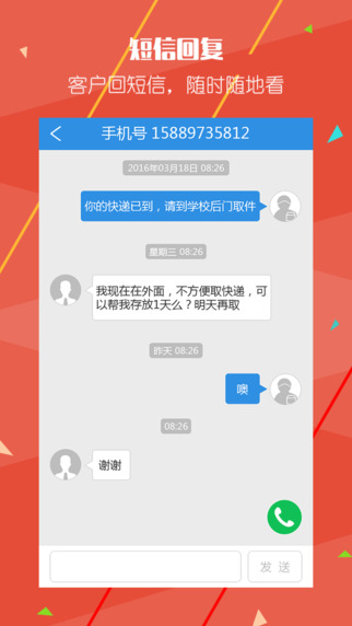 电话:简便操作。收件:可以方便的记录所有用户的收件信息,不让快递员遗忘掉任何一条收件信息。