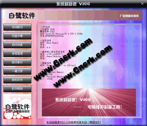 系统超音速 2010 Bata 5 简体中文绿色免费版 系统变慢了?不会装系统?总有病毒来骚扰?没关系!现在有了系统超音速V2010,可以一键提升系统速度、一键绝杀U盘病毒、一键锁定启动项目、一键备份还原系统,而且还具有驱动程序备份功能,是计算机爱好者不可或缺的电脑维修工具。长期使用计算机者更是居家必备。本软件完全免费!强烈推荐下载!
