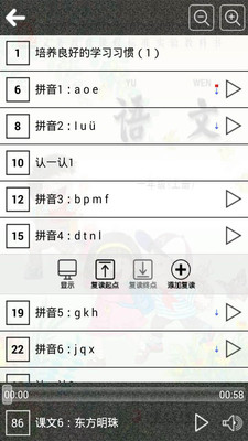 软件可以对课文内容进行复读,可以手动添加和取消复读内容、可以对课文进行手势翻页、放大和缩小,可以使用进度条调节播放内容,应用可以移动到SD卡中。