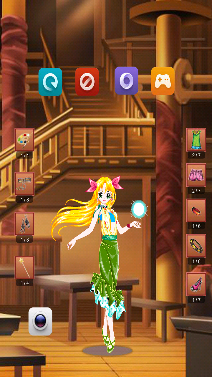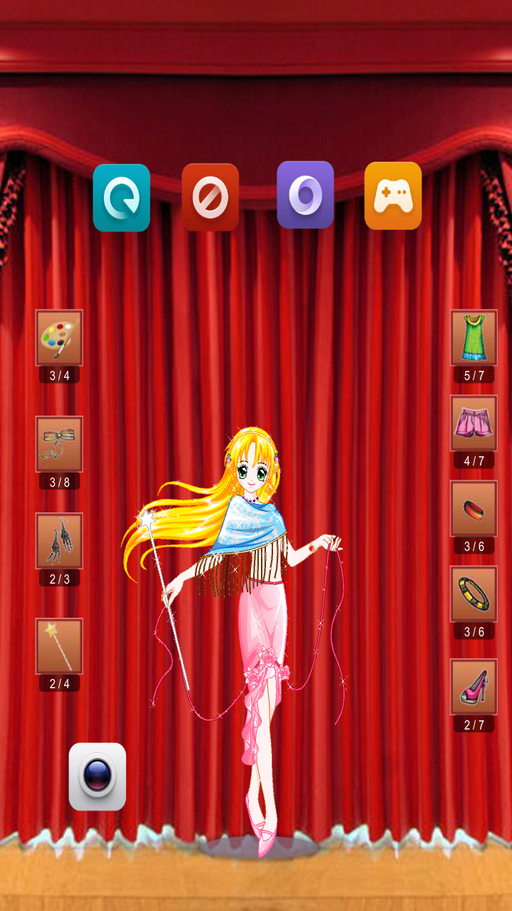 一个换装类游戏。点击衣服图标的按钮可以直接切换衣服,其他的按钮可以切换其他的道具,色随机穿一套衣服和饰品。