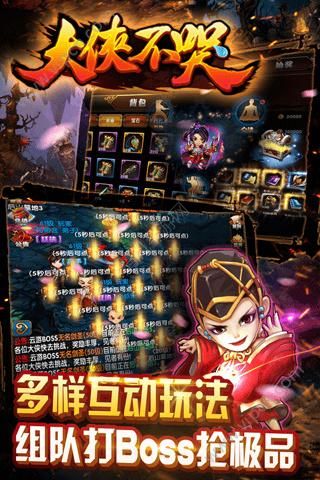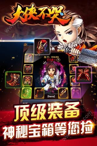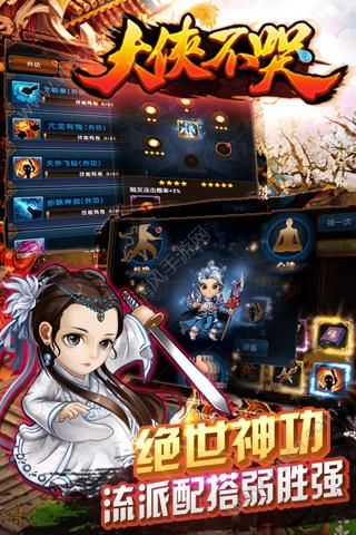 大侠不哭是一款有着超刺激的即时战斗刺激和绚丽多彩的打斗画面的RPG游戏,各类武林高手齐聚一堂,快来选取你喜欢的大侠去纵横江湖吧! 游戏把浓郁的武侠风演绎的淋漓尽致,众多门派武学特色鲜明,豪情壮志玩转热血冒险,稀世神装众人争夺,神秘宝箱搜刮顶级装备~