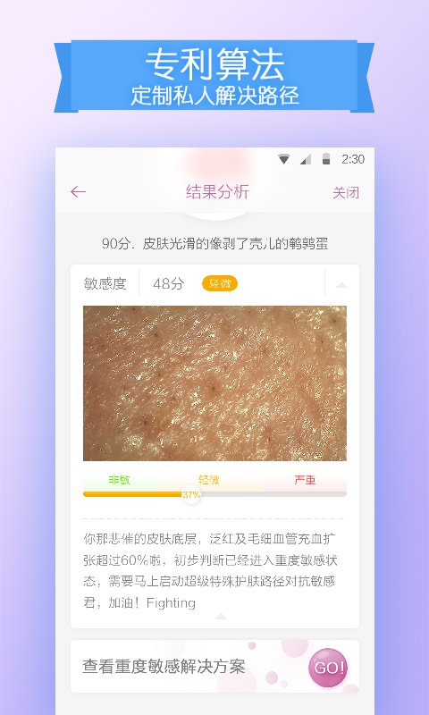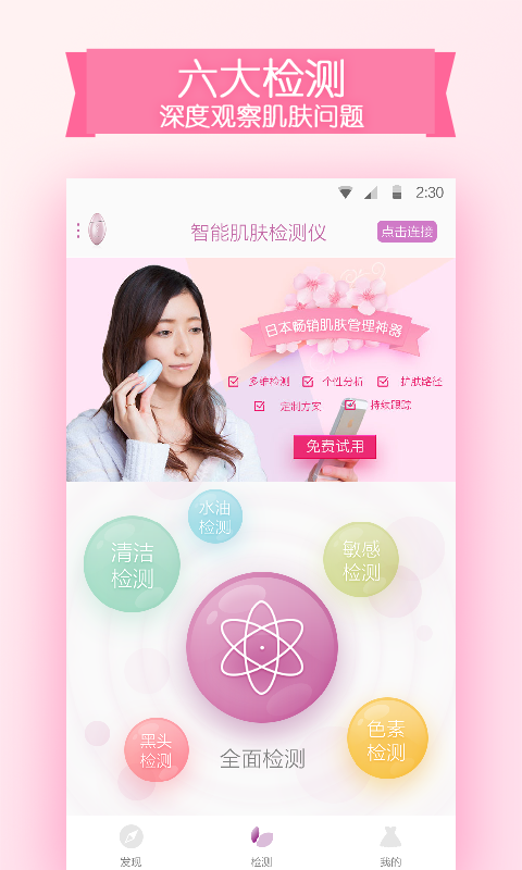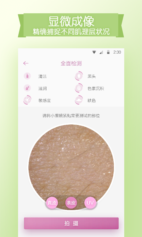 1.肌肤检测:100倍高清光学显微镜头,从肌肤的清洁度、滋润度、敏感度、黑头、色素沉积等五个维度,检测皮肤的当前的状态,深彻评定肌肤状态。